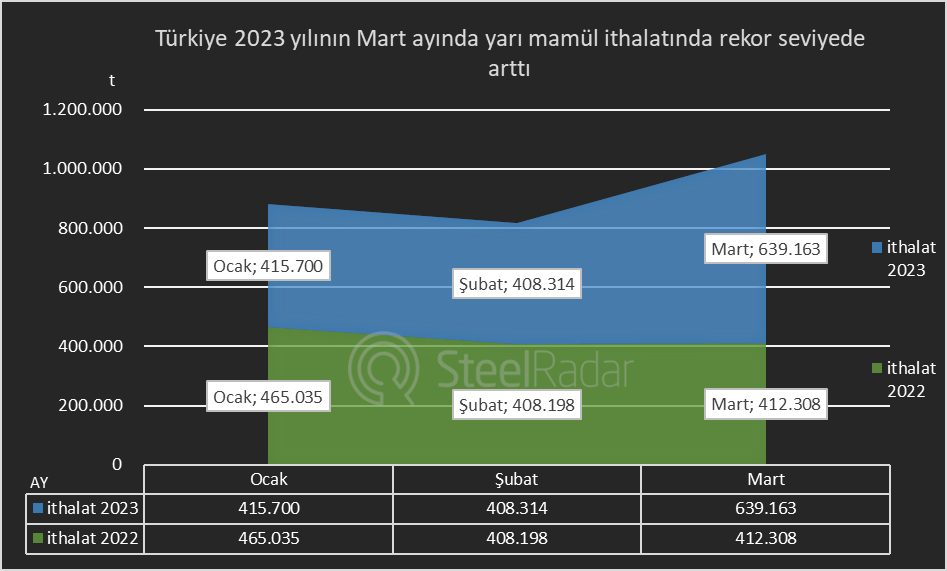 2023 yılının mart ayında Türkiye'nin yarı mamül ithalatı geçen yılın aynı ayına göre %55 artış göstererek 412 bin tondan 639 bin tona yükseldi.