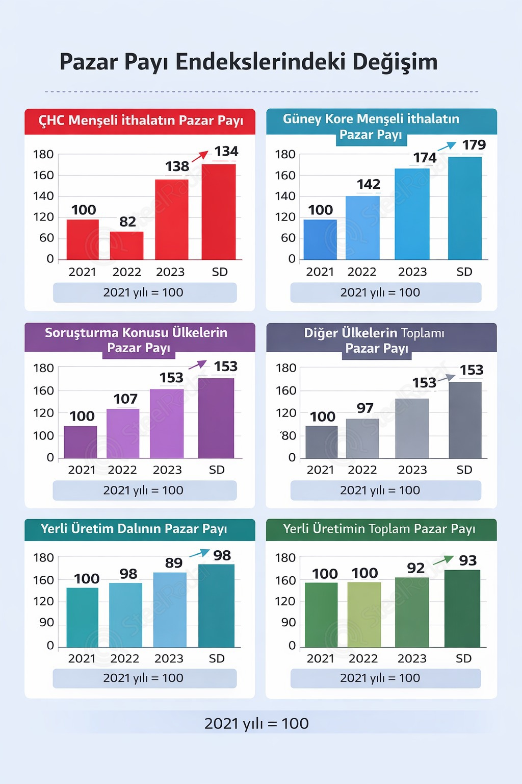 Soruşturma konusu ülkelerin toplam pazar payı, 2021’de 100 birim iken 2022’de 107 birime çıktı ve 2023 ile SD’de 153 birime yükseldi. Buna karşılık diğer ülkelerin toplam pazar payı, 2021’de 100 birim iken 2022’de 97’ye geriledi, 2023’de 98 birim seviyelerine çıktı ve SD’de 92 birime düştü.