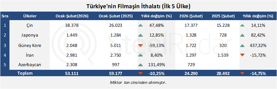Türkiye’nin 2026 yılı şubat ayı filmaşin ithalatı yıllık bazda %14,8 düşüş gösterdi.