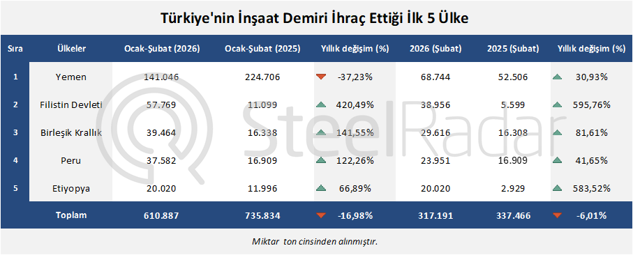 Ocak-Şubat dönemine bakıldığında, toplam inşaat demiri ihracatı yıllık bazda %16,98 düşüşle 735 bin 834 tondan 610 bin 887 tona indi.
